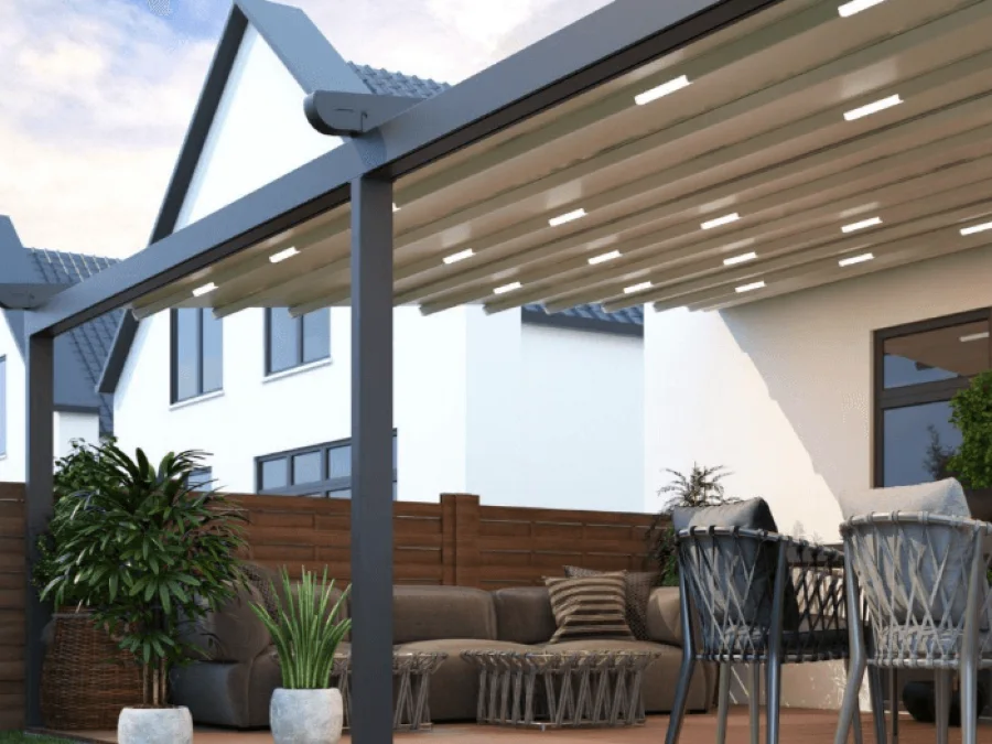 The Pinela is a luxury veranda with a remote control louvred roof system. These roof panels are adjustable up to 120 degrees, and you control the light, shade and temperature at the touch of a button.